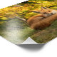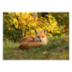 Uma raposa jovem e bonitinha, peers calmamente do seu lugar de repouso pastoso com um fundo de cor de outono.