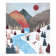 Uma bela paisagem com texturas únicas mostrando um rio e uma paisagem de montanha com uma raposa em caça de salto médio na neve em tons de vermelho, verde, azul e bege.