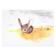 Um lápis colorido de um rato pequeno, morador de deserto, saltando com orelhas grandes e alertas e pelo que é uma mistura de cinzentos claros e escuros e tons de marrom. O fundo é um tom acinzentado e acinzentado, passando gradualmente para uma cor amarelo-arenoso à medida que o plano de fundo se aproxima e preenche quase todo o resto da paisagem do deserto, com os tons azuis sutis das cinzas do céu dando uma sensação de distância e abertura. O estilo de desenho é detalhado, o sombreamento sugere profundidade e tridimensionalidade, mostrando cuidado com detalhes minúsculos como posicionamento de uísque.