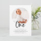 Um primeiro Convite de Aniversário moderno com uma fotografia redonda e a palavra 'Um' com uma letra de estilo caligráfico, perfeito para a festa de primeiro aniversario do seu pequenino!