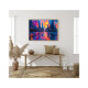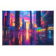 Uma paisagem urbana de neon inspiradora com reflexões vibrantes nas ruas úmidas, captando a beleza de um pôr do sol urbano iluminado. As tons azuis, rosa e laranja brilhantes criam uma vibração futurista do cyberpunk, perfeita para arte moderna e amantes do decoro.