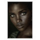 A luminous close-up captures deep ebony skin sculpted by soft light, highlighting razor-sharp cheekbones, full glossy lips, and piercing hazel-green eyes framed by bold winged liner. Natural curls hug the face tightly while small gold hoops and rich green embroidered fabric add refined luxury against a velvety black backdrop. The portrait exudes regal confidence, quiet power, cultural radiance, inner strength, and unapologetic elegance—perfect for bedrooms, living rooms, home offices, therapy spaces, Afrocentric decor, modern minimalist walls, or as empowering gifts for women celebrating heritage, self-love, resilience, beauty in every shade, or bold feminine energy.