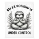 Um sarcasmo design hilariante, bonito e vítreo, dizendo Relaxe Nada Está Sob Controle, piada sarcástica engraçada, preguiça-dama fazendo meditação.