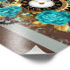 Relógio antigo e patenteado, adornado com joias, mãos de ouro e algarismos latinos com rosa de turquesa sobre fundo castanho e listrado. Estilo Steampunk.