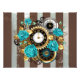 Relógio antigo e patenteado, adornado com joias, mãos de ouro e algarismos latinos com rosa de turquesa sobre fundo castanho e listrado. Estilo Steampunk.