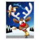 Um divertido cervo de desenho animado com um nariz vermelho brilhante e grandes chifres brancos, adornado com um laço vermelho e dourado, espreita por uma janela aberta. Do lado de fora, uma paisagem nevada com silhuetas de pinheiros e uma pequena casa iluminada é visível sob um céu noturno azul escuro cheio de estrelas. O trenó do Papai Noel puxado por renas está voando ao longe. A cena evoca uma atmosfera festiva e caprichosa de Natal. Arte vetorial original Copyright BluedarkArt TheChameleonArt.