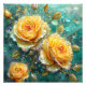 Representação de rosas amarelas vibrantes e intricadas, organizadas de forma bela contra um fundo azul e verde macio. Cada rosa tem pétalas em camadas, mostrando uma variedade de tons rosados e macios com contornos de ouro que acentuam suas curvas. As rosas são intercaladas com folhas verdes e peludas, acrescentando profundidade e contraste. Além disso, a cena é enfeitiçada com gotículas de água misturadas e bolhas iridescentes, que aumentam a frescura e a vivacidade geral da composição, criando um senso de delicadeza e elegância. A imagem apresenta um arranjo vibrante e visualmente deslumbrante de rosas amarelas, cercadas por um pano de fundo brilhante. As rosas são representadas no cheio, exibindo delicadas pétalas que misturam tons de amarelo e de ouro, com detalhes intrincados destacando suas texturas. Entre as flores estão gotículas de água escutando, criando efeito de frescura e vitalidade. Essas gotículas captam a luz, acrescentando qualidade e profundidade tridimensionais à cena. O fundo é uma rica mistura de turquesa e pistas de verde, melhorando o brilho e a beleza gerais das flores. Algumas folhas com tons de verde variados acompanham os rosas, acrescentando ainda mais à composição. A estética geral é uma de elegância e vivacidade, capturando um momento de beleza na natureza.