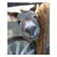 Este burro em miniatura, também conhecido como burro, parece sorrir enquanto empurra a cabeça sobre uma roda de vagão para receber alguma atenção.