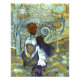 Um design de arte de uma garota e um garoto de mãos dadas andando na floresta.