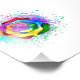 Rosa grande e florescente com pétalas arco-íris sobre fundo branco, pintadas com pedaços de tinta colorida e brilhante. 3d