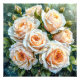Linda disposição de rosas pálidas de cor de pêssego, exuberantes e vibrantes, adornadas com gotículas de água cintilantes que repousam sobre suas pétalas delicadas. Cada rosa é detalhadamente intricada, revelando camadas suaves e texturas complexas. A disposição é complementada por folhas verdes frescas e botões em flor, criando uma aparência harmoniosa e natural. O fundo é uma mistura suave de tons verdes, que realça os tons suaves das rosas, dando à imagem uma atmosfera fresca e serena. As gotículas acrescentam um toque de elegância, sugerindo uma chuva recente ou orvalho, destacando a beleza das flores.