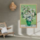 Uma pintura vibrante e viva de Vincent van Gogh, com um buquê exuberante de rosas brancas dispostas em um simples vaso verde. As marcas ousadas e vívidas do artista dão vida às flores contra um fundo verde impressionante.