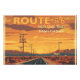 This retro-style illustration captures the iconic Route 66 with a long, straight road stretching into a warm desert sunset. Classic telephone poles, motels, and distant hills add nostalgia and vintage Americana charm. The sunlit sky in shades of orange, yellow, and brown evokes freedom and adventure. Perfect for travel lovers, Route 66 enthusiasts, and fans of scenic open-road and vintage poster art.