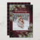 Baseado no meu mais vendido Casamento no inverno Invitation Suite, este cartão de Natal quente e acolhedor design de madeira de burgundy apresenta 'casada & feliz' em um roteiro escrito à mão, sua foto favorita de casamento, e é decorado com flocos de neve com brilho prateado e galhos de pinheiro de aquarela, e uma textura de xadrez de búfalo burro e preto. Personalize com sua foto, nome e ano. Entre em contato com o designer para obter produtos correspondentes ou variações de design e veja o Holiday Suite aqui: https://www.zazzle.com/collections/rustic_burgundy_silver_winter_plaid_wood_christmas-119954909896873769 Copyright Anastasia Surridge for Elegant Invites, todos os direitos reservados.