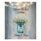 Ponha o tom para a sua celebração rústica com esta placa de poster do casamento que contém um jarro de pedras cheio de hálito de bebê, luzes brilhantes de cordas e um fundo de prancha de madeira. Ideal para casamentos de celeiro, locais de fazenda ou recepções no país, esta placa versátil funciona lindamente como um sotaque de boas-vindas, assento ou decorativo. Personalize com sua própria mensagem para corresponder ao seu evento.