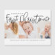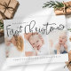 A design na frente consiste na tipografia cursiva lúdica de "Primeiro Natal". Adicione uma foto personalizada do seu novo bebê e adicione o nome do bebê e da família. Este design é moderno, chique, brincalhão e divertido.