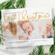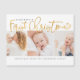 A design na frente consiste na tipografia cursiva lúdica de "Primeiro Natal". Adicione uma foto personalizada do seu novo bebê e adicione o nome do bebê e da família. Este design é moderno, chique, brincalhão e divertido.