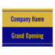 Uma grande placa de abertura permite que todos saibam que o seu negócio abriu as portas ao público. O texto falho dourado no fundo diz "Grande Abertura". O texto dourado está em uma faixa azul marinho. Uma faixa de ouro falso no topo tem texto de exibição azul marinho para o nome da empresa.