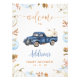 Chá de fraldas Pumpkin Azul Boas-vindas Sinal de Boas-vindas chá de fraldas de carrinho de outono do Sign Boy apresentando um caminhão azul escuro e abóboras brancas e azuis claras. Esta design apresenta também uma folhagem castanha de outono, uma rubrica caligráfica moderna e é ideal para o chá de fraldas de outono de um rapaz.