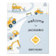 Primeiro aniversario de Construção Moderno Sinal de Boas-vindas em Moderno e cinza, construção amarela com o primeiro sinal de boas-vindas de aniversário com cinco veículos de construção, estrada de cinza e um sinal amarelo. Este cartaz de aniversário de construção poderia ser usado para qualquer idade à medida que a idade for editável.