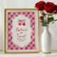 Aperte o seu chá de fraldas com este cartaz de cereja! Projetado com cerejas aquosas amarradas em um arco rosa e um fundo alegre de gingham, ele diz: "Bebês são doces - Por favor, façam um tratado." Perfeito para decorar sua sobremesa, doce, ou mesa de lanche, este sinal gravatas seu chá de fraldas de cereja maravilhosamente.