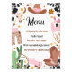 Cardápio de Comida de aniversário Rustic Pink First Rodeo Birthday Sign Bold principalmente com cartaz de comida de aniversário rodeado de uma menina rosa e rosa, com chapéu de vaquinha marrom e rosa, crânio de touro, cacto, corda, luva de vaquinha, botas e muito mais.