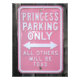 Uma fotografia de um cartaz de estacionamento rosa, engraçado e humorístico, que diz que o lugar é reservado apenas para a princesa e todos os outros serão bronzeados...