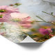 Esta impressão é uma fotografia de Snowdrop, um doce pequeno Cachorro Maltês sentado ao lado de algumas adoráveis flores cor-de-rosa do Cosmos numa brisa de Verão suave.