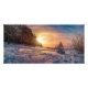 Vista panorâmica do pôr do sol sobre a paisagem de inverno, coberta de pinheiro e abetos de neve contra a luz dramática da noite. Costa do mar Báltico de neve