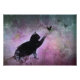 Uma imagem surreal de um gato preto com olhos verdes perseguindo borboletas. O fundo tem capas de flores cor-de-rosa. Muito sonhador.