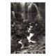 Foto em preto e branco da parte inferior da cascata, Spray Falls, localizada no Parque Nacional do Monte Rainier. A água flui da borda de um penhasco. As correntes de água descem até a base do penhasco. Os riachos separados de água então se piscinas juntos e depois se retorcem através e sobre as rochas até seu destino final. A base da paisagem da cascata e do leito do rio está repleta de rochas. Imagem Copyright ©2023 Kimberly J Tilley. zazzle.com/store/developingnature