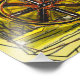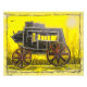 A Dark Wooden Stagecoach sits under a scorching desert sun landscape on a desolate dirt path among cactus as birds fly overhead. Old West image black coach on yellow background with a barbwire border around the outside edge of the image adding a rough persona and sharp edge of what one of the Old West's mode of transportation was.