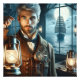 Um guardião de um farol a vapor numa noite iluminada com naves a navegar ao fundo e olhos azuis atordoantes inspirados pelo mistério do mar.