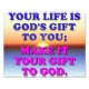 SUA VIDA É O PRESENTE DE DEUS PARA VOCÊ; FAÇA DELA O SEU PRESENTE PARA DEUS. Esta imagem colorida é uma fonte de inspiração e encorajamento excelente para todos os cristãos que acreditam em Deus. Diz simplesmente que tal como Deus nos deu a dádiva da vida, devemos viver as nossas vidas por ele. Porque afinal, ele é o único que pode criar a vida! Peça sua cópia do poster com uma bela imagem hoje!