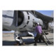 O técnico de combustível da aviação liga uma linha de combustível a um Harrier AV-8B.