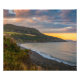 Experience the peaceful serenity of an Irish evening with this image capturing the beautiful Greystones Beach in County Wicklow, Ireland. As the sun sets, a dramatic golden and orange glow illuminates the horizon, contrasting with the moody clouds and dark headland known as Bray Head in the distance. The calm water reflects the vibrant sky, creating a tranquil scene along the pebble and sand coastline that offers a perfect, scenic escape from nearby Dublin.