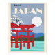 Travel Japan, vintage travel poster, cherry blossoms, mountains and welcome gate.