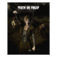 Trick or Treat text can be customized by you. Thin female carrying a lamp and a bone through woods at night, with a dog as a companion.