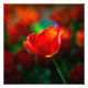 Flor de tulipa vermelha brilhante contra fundo verde escuro e manchas vermelhas de outras flores de tulipa. O símbolo da nova vida. Brilhante, iluminado, irradiado e inspirador! Fotografia texturizada.