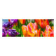 Violeta colorida, tulipas roxas, cor-de-rosa num leito de flores. Praticamente todas as cores do arco-íris estão presentes. Bela e positiva cena floral. Fotografia macro.