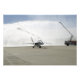 Um avião F-18 rolha debaixo do spray de caminhões-bombeiros com F-18.