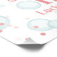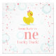Tema da primeira festa de aniversário "Um Pato Sortudo" com pata de borracha com arco rosa cercado por confete, bolhas e texto rosa.