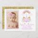 O convite de aniversário do unicórnio e do arco-íris desta doce menina é uma maneira ideal de convidar o seu convidado para a sua festa. O fundo é branco com um padrão de bolinhas rosa esmaecido. A foto da sua garotinha aparece no lado esquerdo do convite dentro de um quadro cor-de-rosa. A parte de trás do convite é uma imagem falsa de ouro brilhante. Para mais convites de aniversário de fotos de meninas, visite a loja. O rosto unicórnio desta garota e o convite de aniversário do arco-íris estão prontos para serem personalizados.