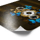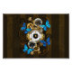 Composição do relógio de aço redondo com discagem numérica romana preta, decorado com engrenagens de ouro e latão, borboletas morfo azuis e lentes danificadas sobre fundo listrado castanho. Estilo Steampunk.