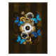 Composição do relógio de aço redondo com discagem numérica romana preta, decorado com engrenagens de ouro e latão, borboletas morfo azuis e lentes danificadas sobre fundo listrado castanho. Estilo Steampunk.
