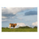Foto impressão de uma vaca loira d'Aquitaine olhando em direção ao espectador sob algumas nuvens em um campo na região de Dordogne, na França.