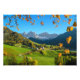 Foto impressão da aldeia de Ruas. Magdalena ou Papais noeis Maddalena com a igreja característica em frente dos picos da montanha Geisler ou Odle Dolomites no Vale do Val di Funes (Villnoesstal), em Itália, no outono, rodeado de folhas de outono.