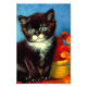 Impressão de fotografia com um lindo gato de smoking Van Gogh! Esta pequena gatinho se posiciona ao lado de uma cesta de flores laranja sobre uma mesa vermelha. Um presente de excelente para amantes de gatos e colecionadores de arte holandeses!