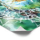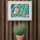 Nature Art. A captivating watercolour painting of a European robin (Erithacus rubecula) perched on a thorny branch. The bird's feathers are rendered in a vibrant palette of orange, yellow, blue, and green, contrasting beautifully with the soft, ethereal green background. This expressive nature artwork highlights the robin's charm and spirit, ideal for bird lovers and art collectors seeking unique wildlife pieces.