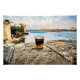 Um copo sereno de chá em uma mesa robusta de pedra com uma cena litorânea pacífica pintada de forma macia e artística no fundo, proporcionando um momento de tranquilidade.